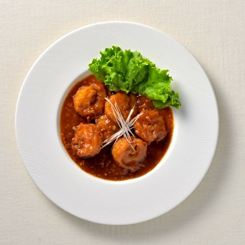 食べ応えのある海老に2種類の豆板醤を使用し、甘さと辛さと香ばしさが調和したソースを絡めた逸品。
