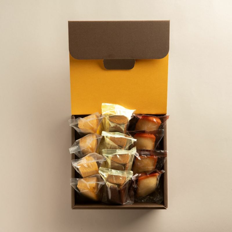 人気の焼き菓子カットバウムとフィナンシェの詰め合わせです。 ギフト用化粧箱でご用意いたします。 ※化粧箱の体裁は変更になる場合がございます
